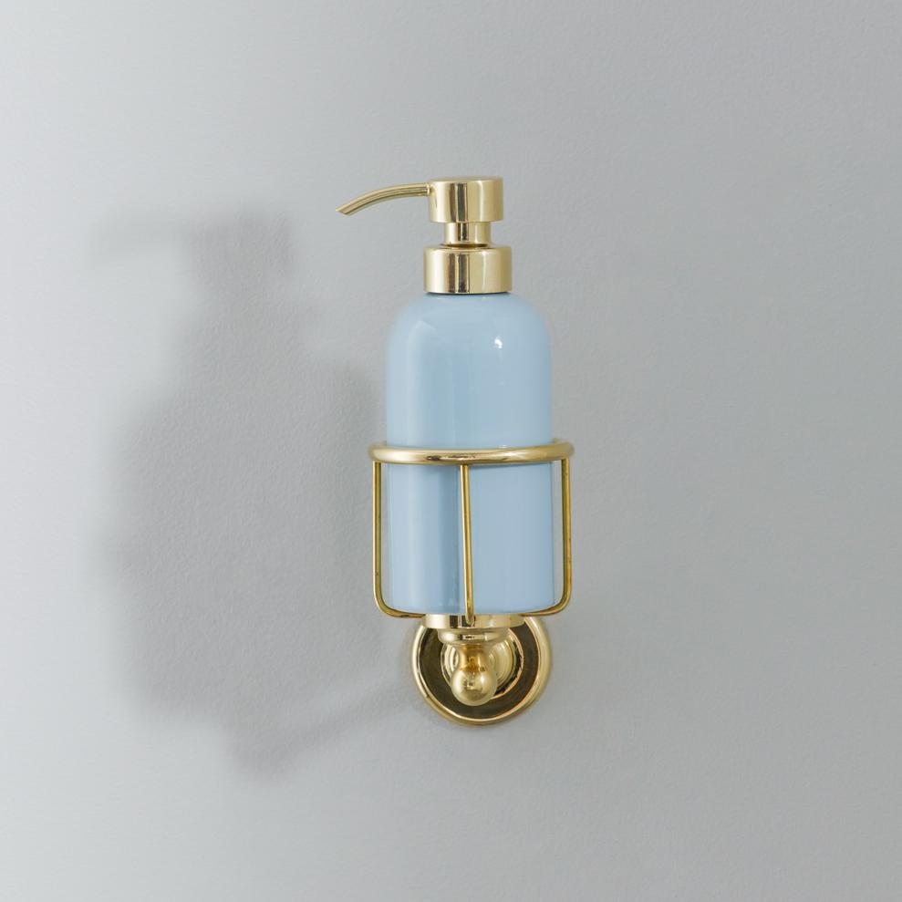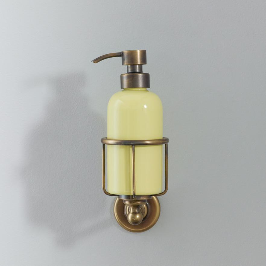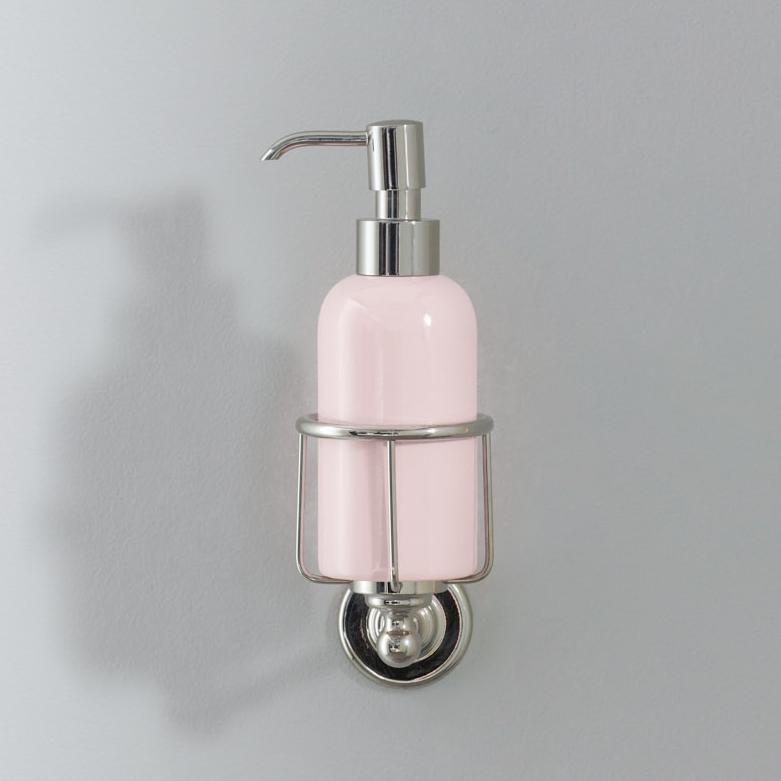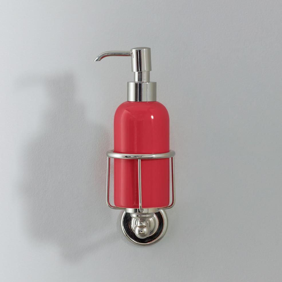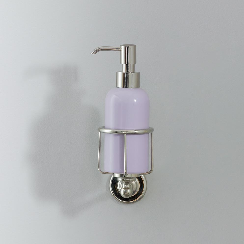 Rockwell liquid soap dispenser. Available in lilac/Bonbon, orange/Squash, black/Liquorice/Ink, white/Snowdrop, grey/Seattle, green/Willow, blue/Powder and yellow/Sherbet. Shown here in yellow/Sherbet. Each soap dispenser will come with metal cage which can be attached to the wall.