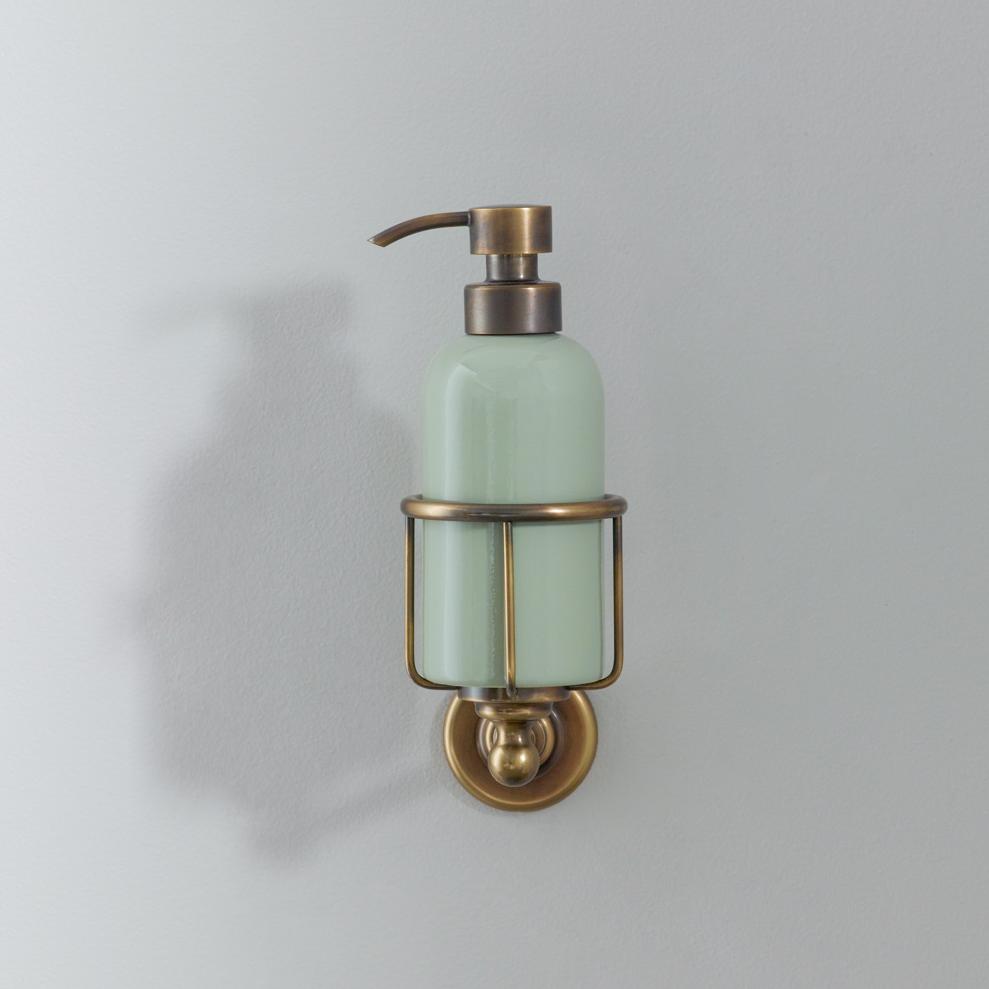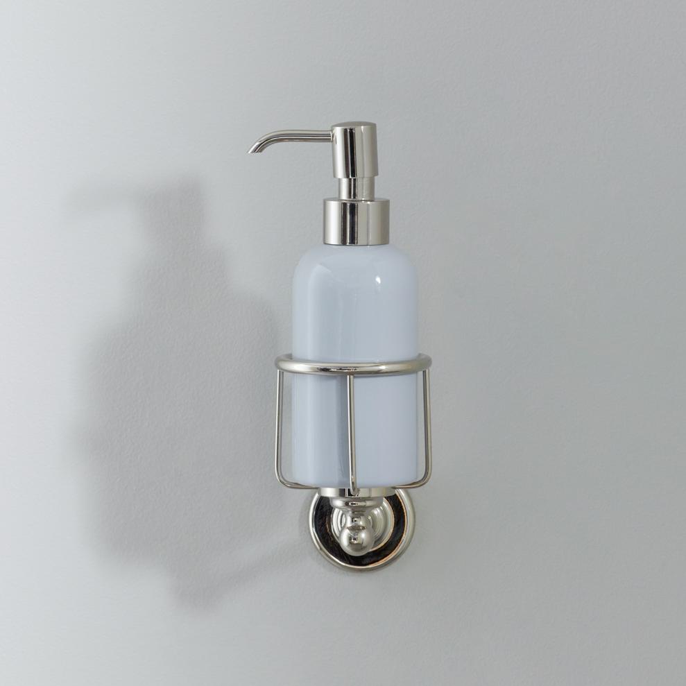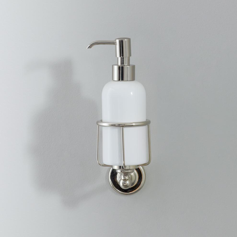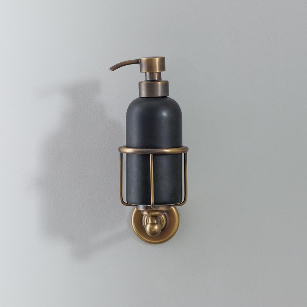 Rockwell liquid soap dispenser. Available in lilac/Bonbon, orange/Squash, black/Liquorice/Ink, white/Snowdrop, grey/Seattle, green/Willow, blue/Powder and yellow/Sherbet. Shown here in yellow/Sherbet. Each soap dispenser will come with metal cage which can be attached to the wall.