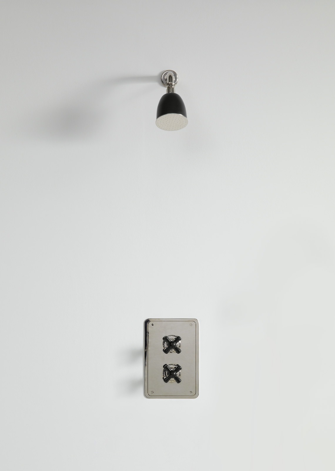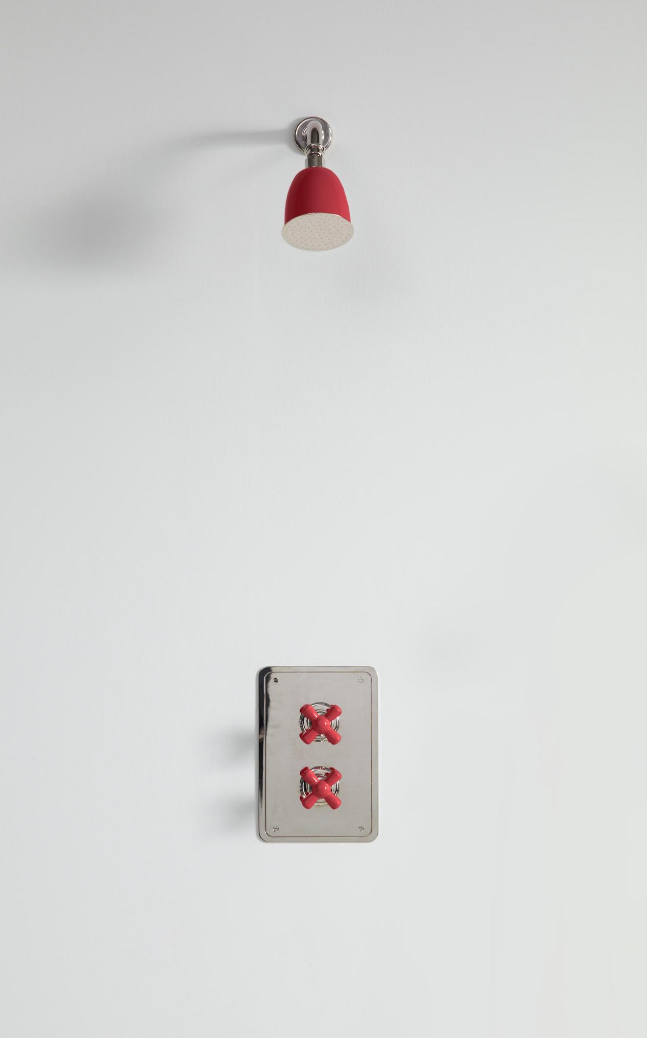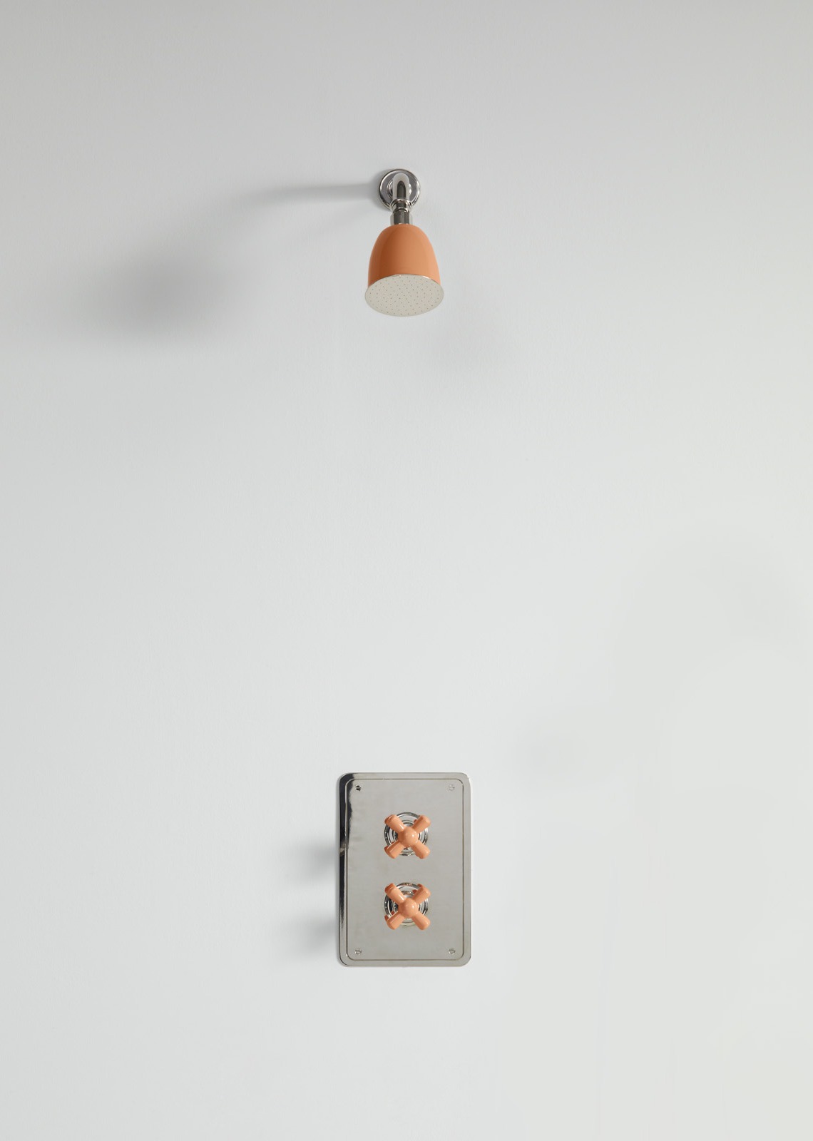 Rockwell wall mounted shower arm with shower rose, to be used with our wall mounted concealed thermostatic control and 3/4" shut off valve mounted on rectangular plate. Crossheads, and shower rose can either be in all metal or coloured ceramic: lilac/Bonbon, orange/Squash, gloss black/Graphite/Ink, matt black/Liquorice, white/Snowdrop, grey/Seattle, pale pink/Conch, red/Lipstick, green/Willow, blue/Powder and yellow/Sherbet.