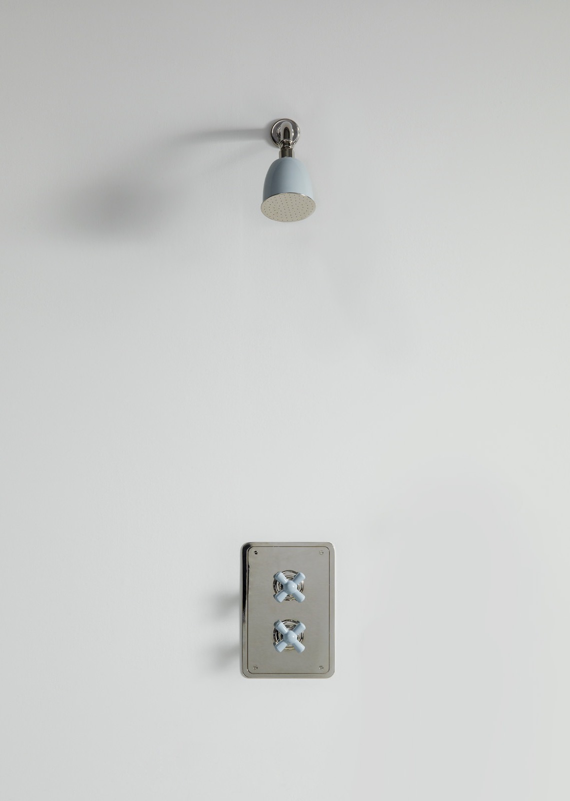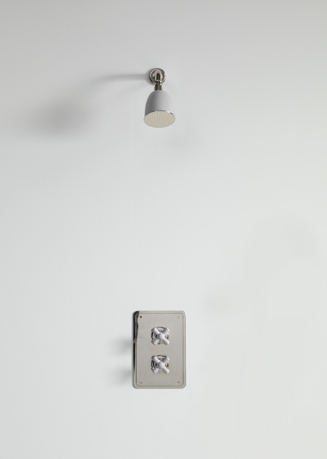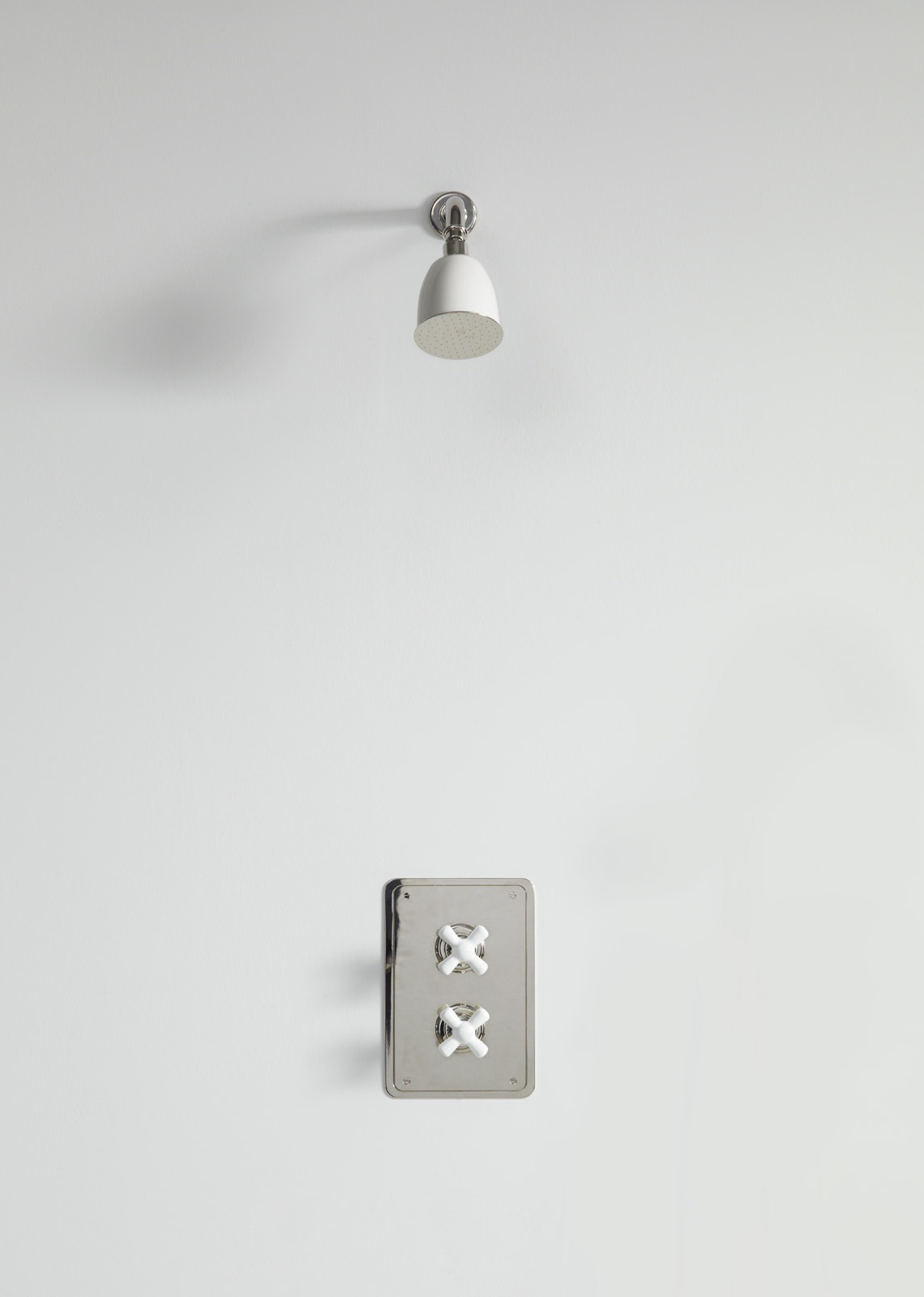 Rockwell wall mounted shower arm with shower rose, to be used with our wall mounted concealed thermostatic control and 3/4" shut off valve mounted on rectangular plate. Crossheads, and shower rose can either be in all metal or coloured ceramic: lilac/Bonbon, orange/Squash, gloss black/Graphite/Ink, matt black/Liquorice, white/Snowdrop, grey/Seattle, pale pink/Conch, red/Lipstick, green/Willow, blue/Powder and yellow/Sherbet.