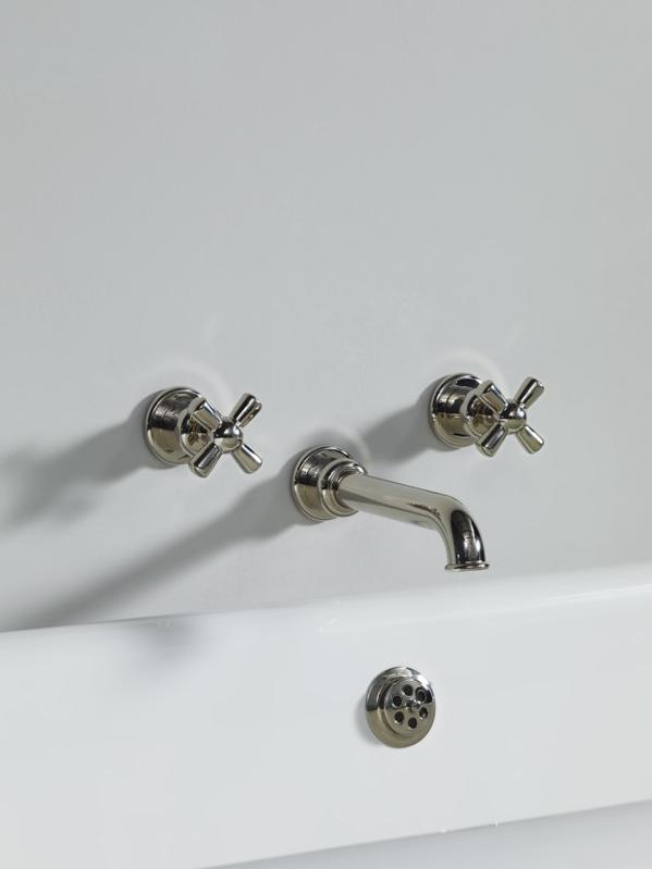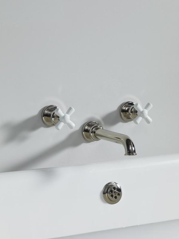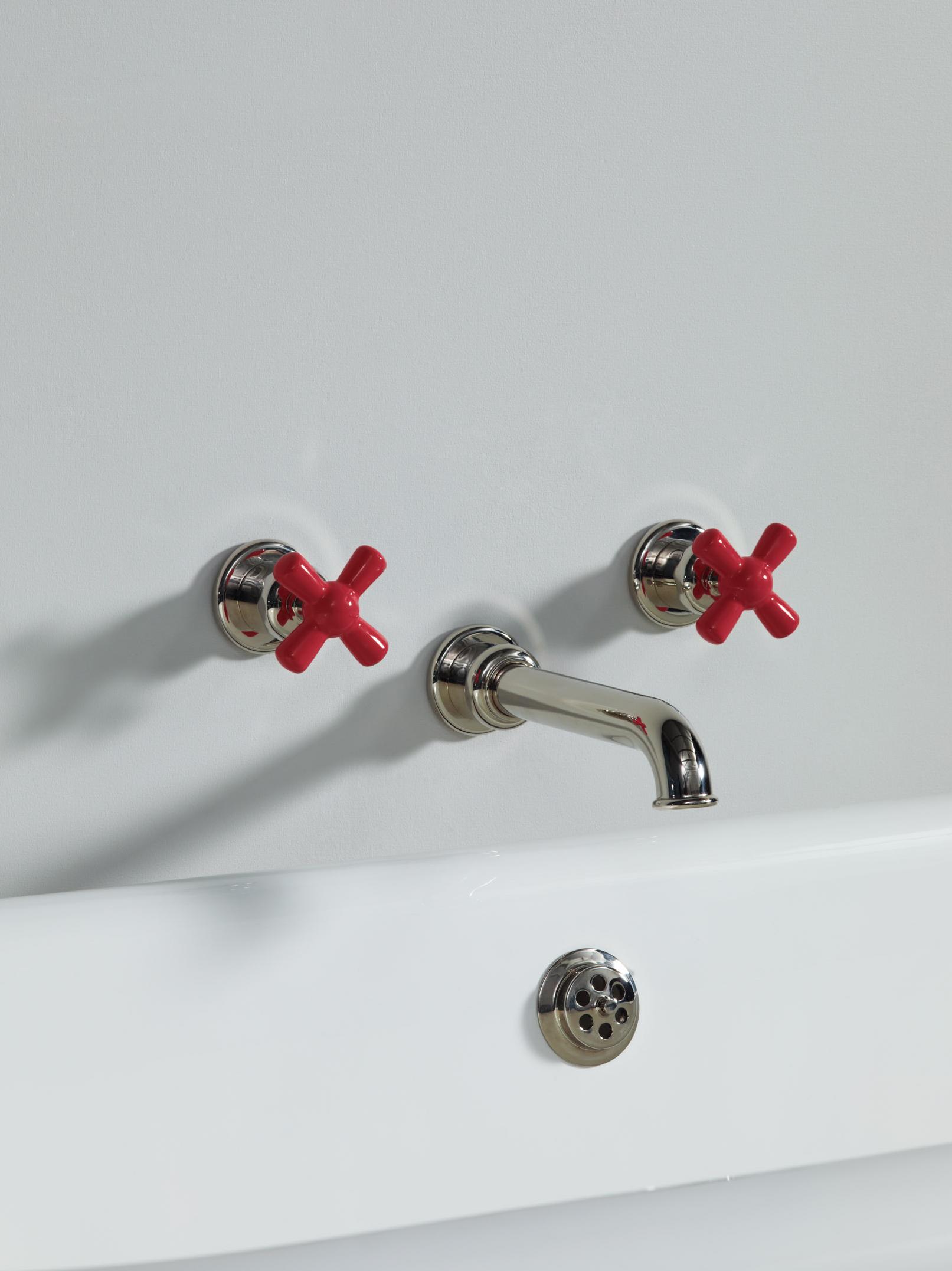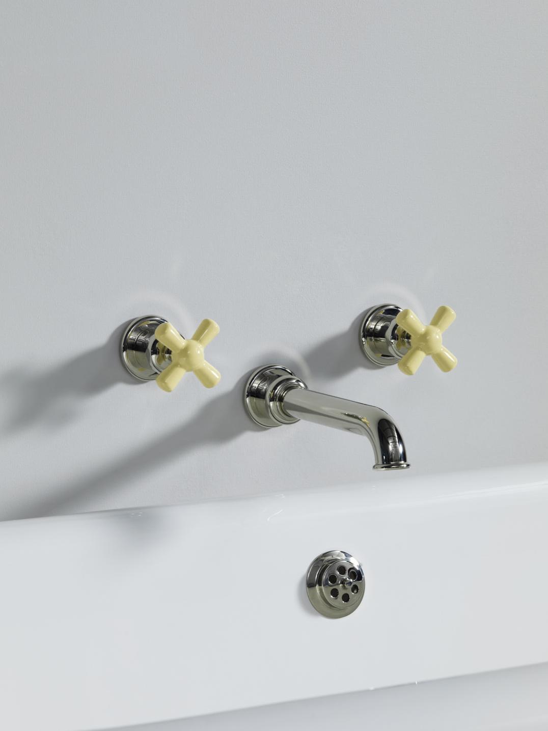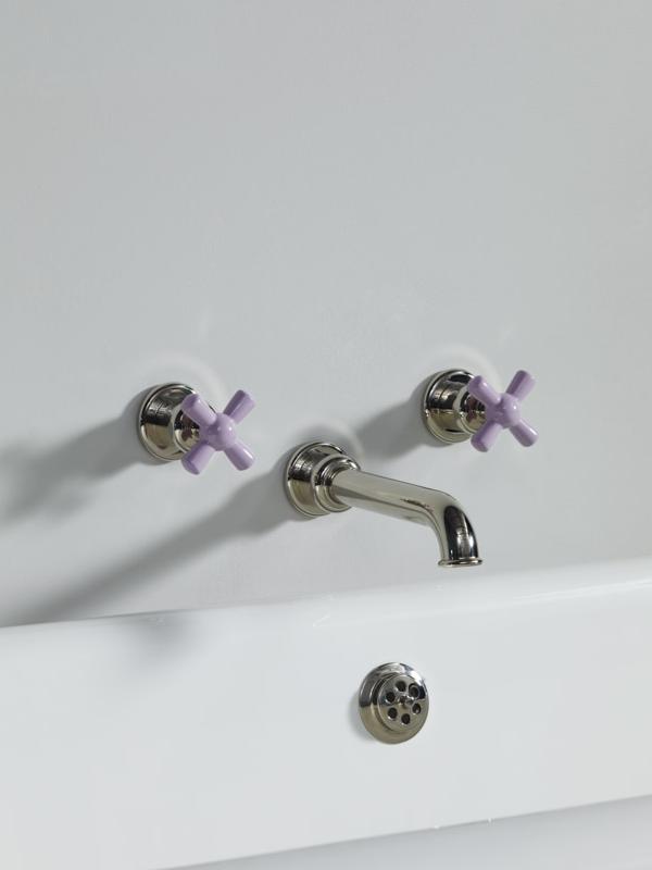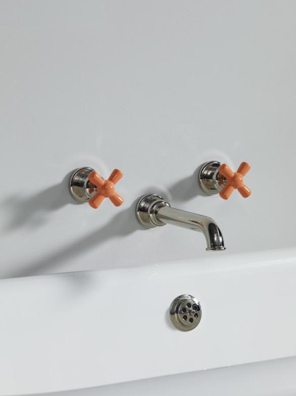Rockwell wall mounted bath taps with tubular spout. Available with all metal crossheads or can also come in coloured ceramic - lilac/Bonbon, orange/Squash, black/Graphite/Ink, white/Snowdrop, grey/Seattle, green/Willow, blue/Powder and yellow/Sherbet, pale pink/Conch and red/Lipstick. Available in 3 different spout lengths